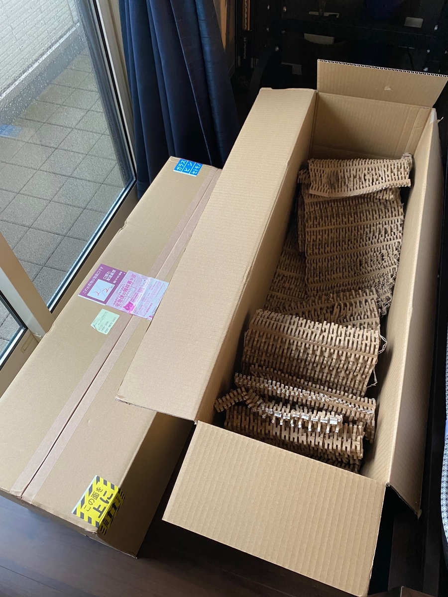 まずこちちらが段ボールの荷物が届いて,開封したときの様子です。プランターサイズが幅75cm,しかも2個なのでかなりの大きさです。。