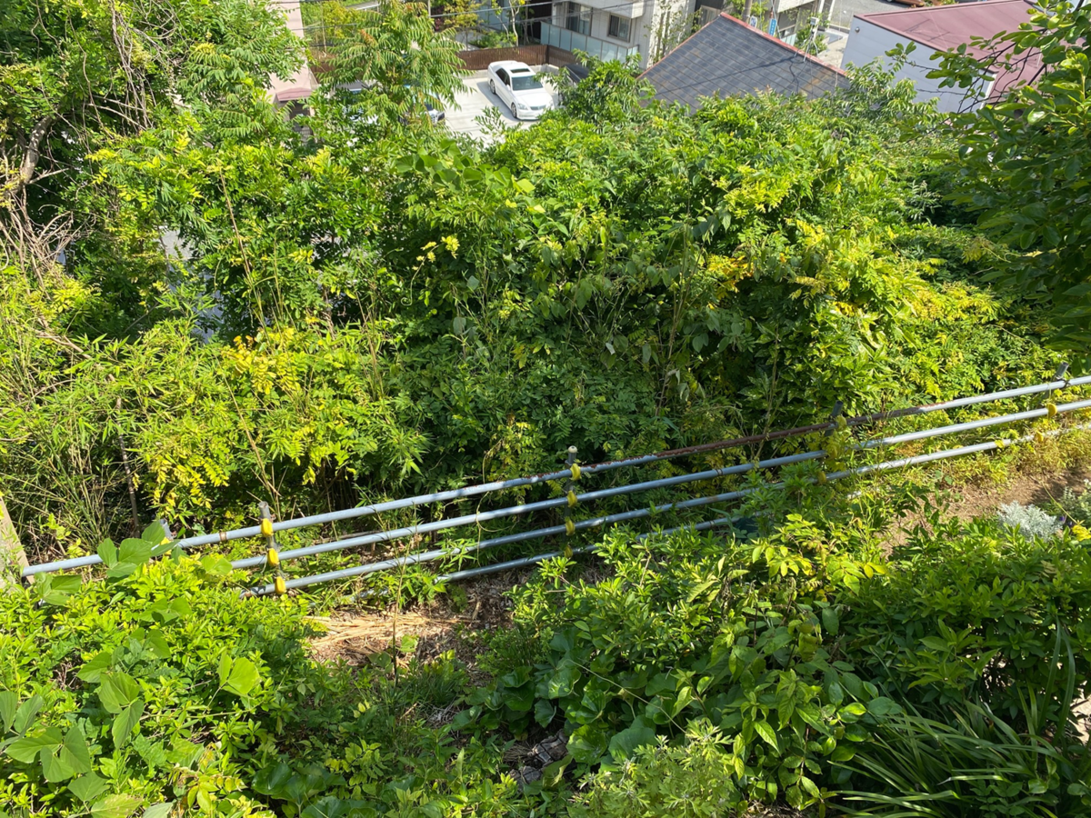 例年,6月以降に雑草の勢いが増して,この鉄パイプの柵を乗り越えて見えなくなるくらいに雑草が繁殖します。