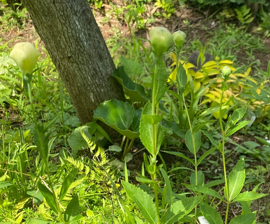 すっかり存在を忘れていましたが,6月に裏庭を歩いていると,草丈60cm位の見慣れない風船のような形をした蕾をつけた植物が。