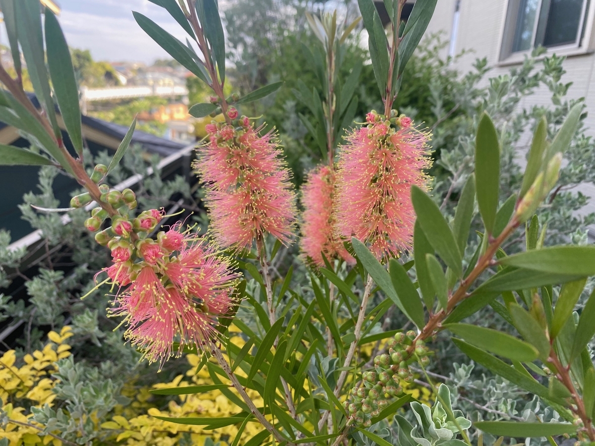 冬になりました。カリステモンは常緑のため殆ど落葉しないです。シンボルツリーとして寂しくならないのはポイントが高いです。