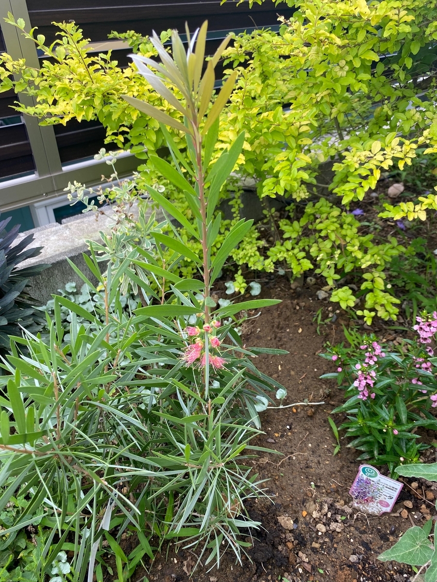 秋ごろに「カリステモン・ピンクシャンペン」の4号鉢の苗を購入しました。以前育てた「ドーソンリーバー」は鉢植えで水やりを長期忘れたときに枯れてしまったので,今回は地植えで育てることにしました。
